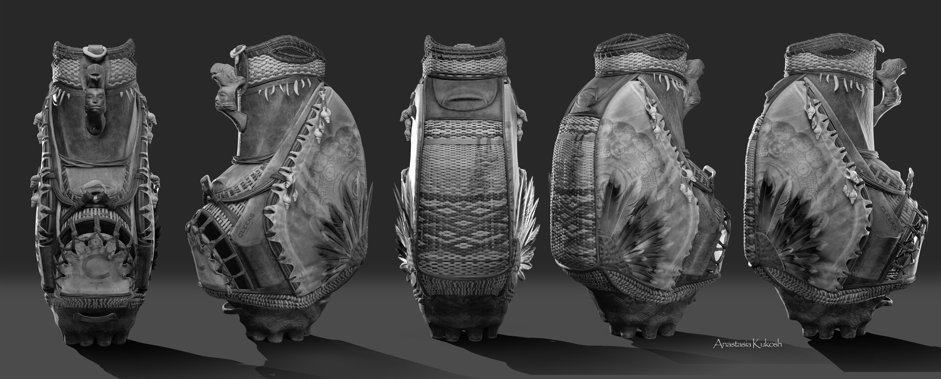 A 3D conceptual design of a handcrafted golf bag inspired by Indigenous art and landscapes of Louisiana. Combining woven cane, feather, shell details, and organic textures, it reinterprets Mississippian symbolism through contemporary design.